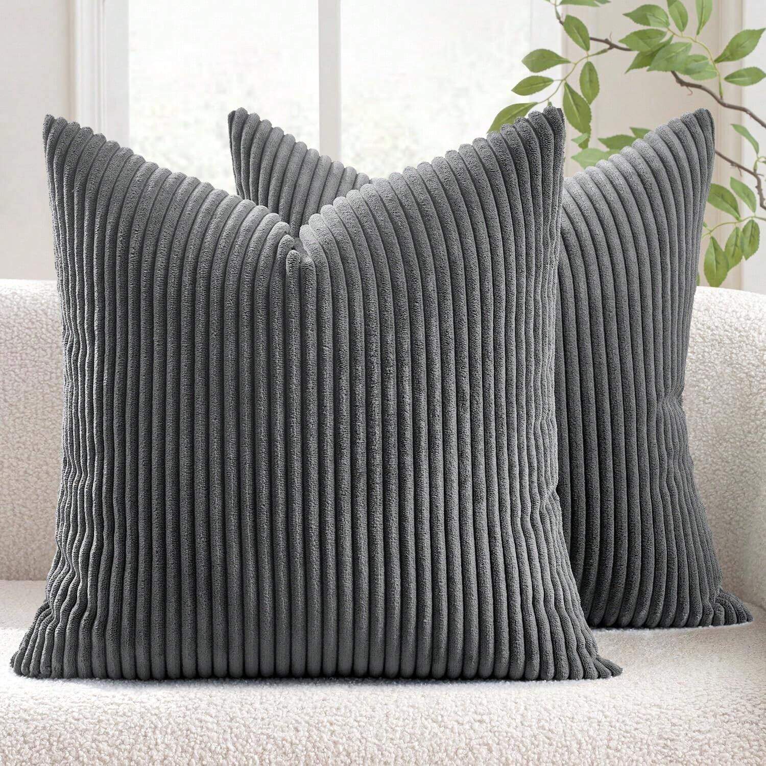 Set of 2 Dark Grey Corduroy Striped Velvet Cushion Covers for Sofa & Living Room